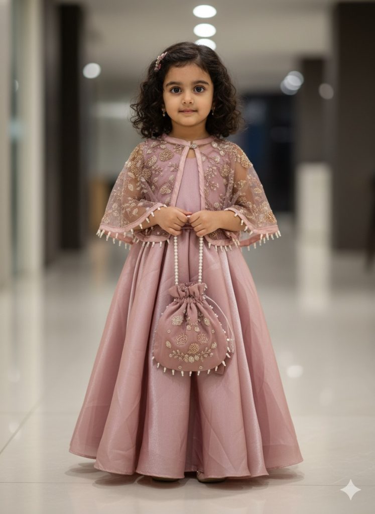 Elevate your style with our stunning Maxi dress, featuring an attached cancan, trending capshawl, and potli. Made from luxurious satin silk, this trendy outfit is perfect for any occasion. The potli detailing adds a touch of elegance, making it a must-have in your wardrobe.