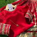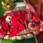 Traditional meets modern! Gota work lehenga,beautiful neckline shirt,doppata and bridal look potli bag perfect for event✨